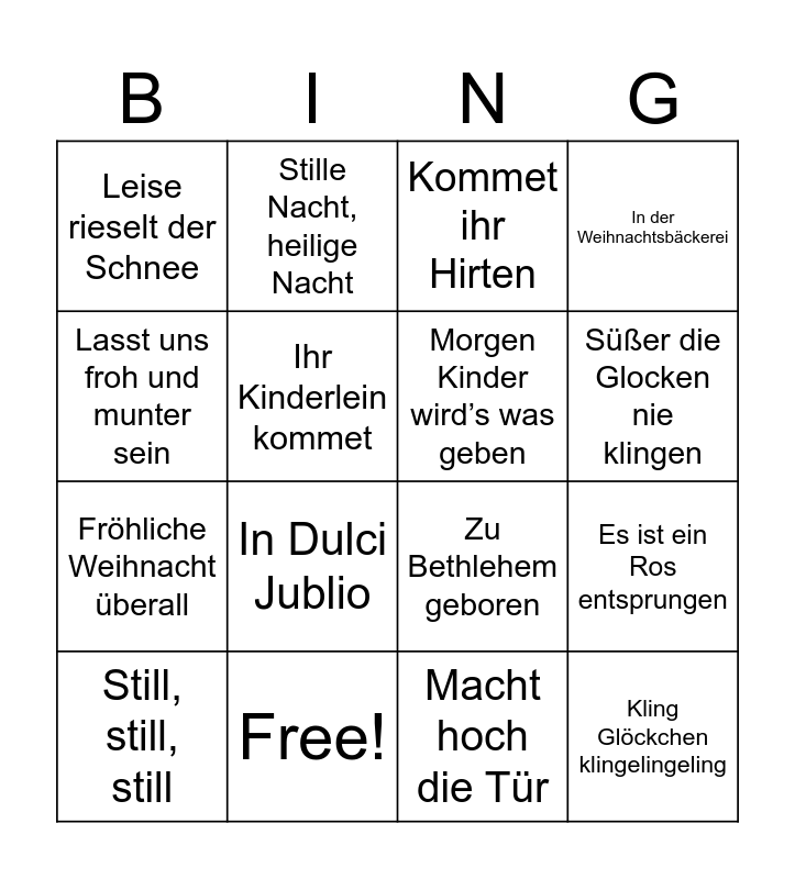 This bingo card has 22 words: Free!, Oh du fröhliche, Stille Nacht, heilige Nacht, Oh Tannenbaum, Ihr Kinderlein kommet, Morgen Kinder wird’s was geben, Leise rieselt der Schnee, Kommet ihr Hirten, Zu Bethlehem geboren, Kling Glöckchen klingelingeling, Fröhliche Weihnacht überall, In der Weihnachtsbäckerei, Alle Jahre wieder, Schneeflöckchen, Weißröckchen, Macht hoch die Tür, Am Weihnachtsbaume, die Lichter brennen, Es ist ein Ros entsprungen, Still, still, still, In Dulci Jublio, Lasst uns froh und munter sein, Süßer die Glocken nie klingen and Morgen kommt der Weihnachtsmann.