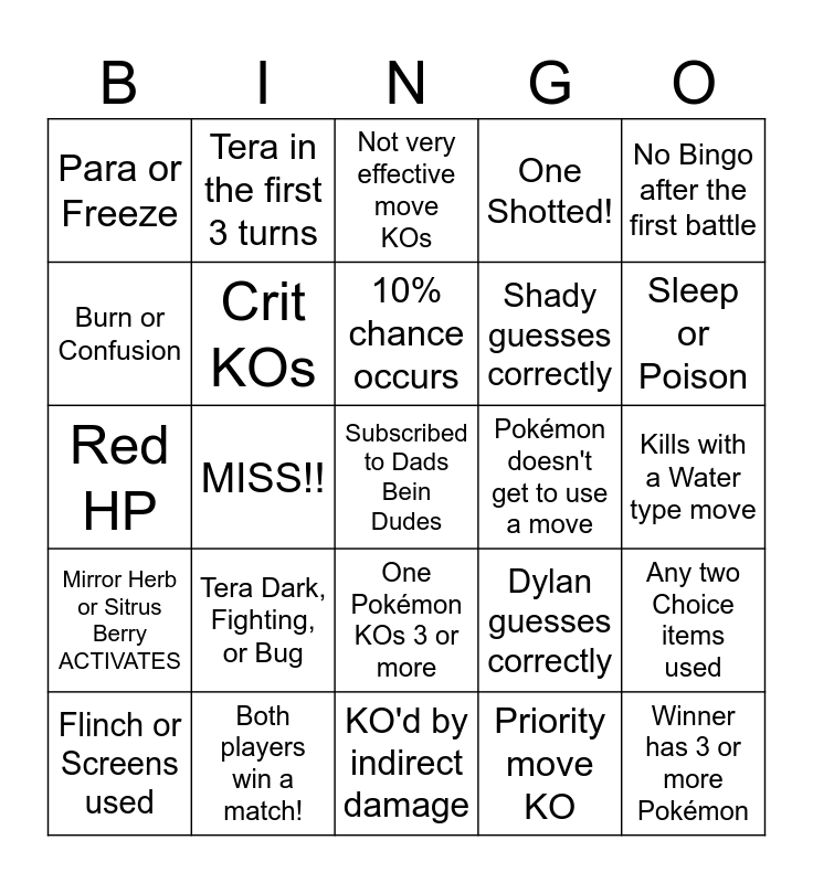 This bingo card has a free space and 24 words: Tera Dark, Fighting, or Bug, Both players win a match!, 10% chance occurs, Flinch or Screens used, No Bingo after the first battle, Para or Freeze, Burn or Confusion, Tera in the first 3 turns, Pokémon doesn't get to use a move, One Pokémon KOs 3 or more, Shady guesses correctly, Red HP, Dylan guesses correctly, Any two Choice items used, Crit KOs, Priority move KO, Kills with a Water type move, Not very effective move KOs, Sleep or Poison, MISS!!, Winner has 3 or more Pokémon, Mirror Herb or Sitrus Berry ACTIVATES, One Shotted! and KO'd by indirect damage.