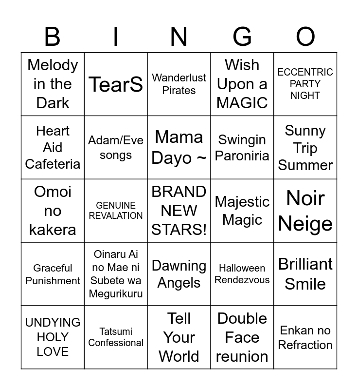 This bingo card has a free space and 24 words: Oinaru Ai no Mae ni Subete wa Megurikuru, Tatsumi Confessional, Mama Dayo ~, UNDYING HOLY LOVE, ECCENTRIC PARTY NIGHT, Melody in the Dark, Heart Aid Cafeteria, TearS, Majestic Magic, Dawning Angels, Swingin Paroniria, Omoi no kakera, Halloween Rendezvous, Brilliant Smile, Adam/Eve songs, Double Face reunion, Noir Neige, Wanderlust Pirates, Sunny Trip Summer, GENUINE REVALATION, Enkan no Refraction, Graceful Punishment, Wish Upon a MAGIC and Tell Your World.