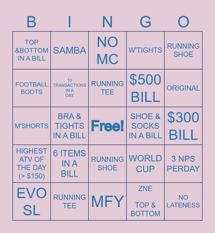 This bingo card has a free space and 24 words: EVO SL, 6 ITEMS IN A BILL, RUNNING TEE, ZNE TOP & BOTTOM, RUNNING SHOE, TOP &BOTTOM IN A BILL, SAMBA, NO MC, SHOE & SOCKS IN A BILL, $300 BILL, M'SHORTS, 10 TRANSACTIONS IN A DAY, WORLD CUP, 3 NPS PERDAY, FOOTBALL BOOTS, RUNNING TEE, MFY, W'TIGHTS, ORIGINAL, HIGHEST ATV OF THE DAY (> $150), BRA & TIGHTS IN A BILL, RUNNING SHOE, $500 BILL and NO LATENESS.