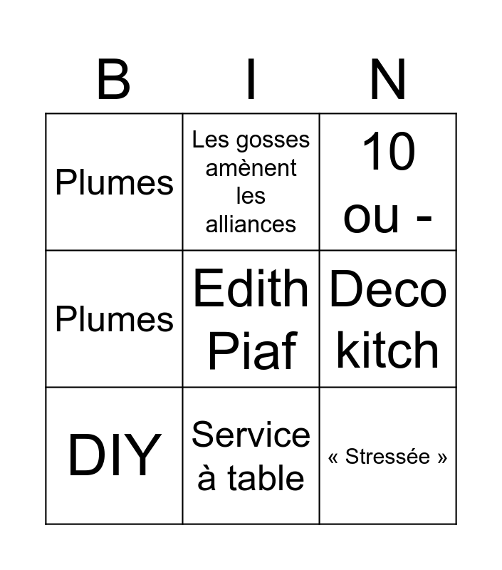 This bingo card has a free space and 11 words: Plumes, Service à table, « Stressée », DIY, Les gosses amènent les alliances, 10 ou -, Deco kitch, «Pas la vie en rose », Plumes, Plumes and Plumes.