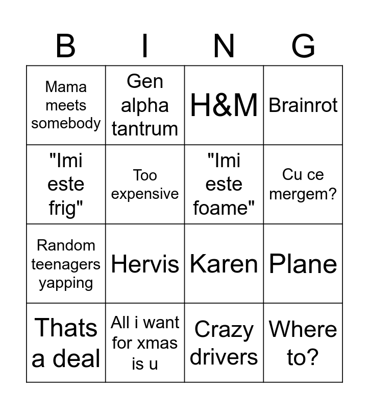 This bingo card has 16 words: All i want for xmas is u, Plane, H&M, Mama meets somebody, Random teenagers yapping, Gen alpha tantrum, Karen, Crazy drivers, "Imi este frig", Too expensive, Thats a deal, Brainrot, Hervis, Cu ce mergem?, "Imi este foame" and Where to?.