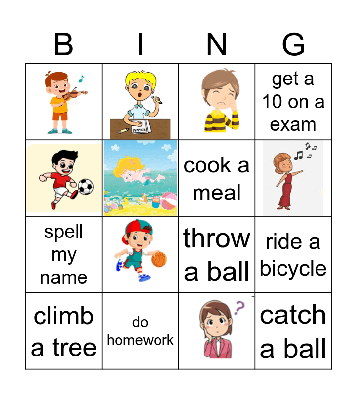 This bingo card has 11 images and 13 words: do homework, play the guitar, spell my name, throw a ball, climb a tree, speak english, cook a meal, write a strory, ride a bicycle, climb a tree, catch a ball, get a 10 on a exam and drive.