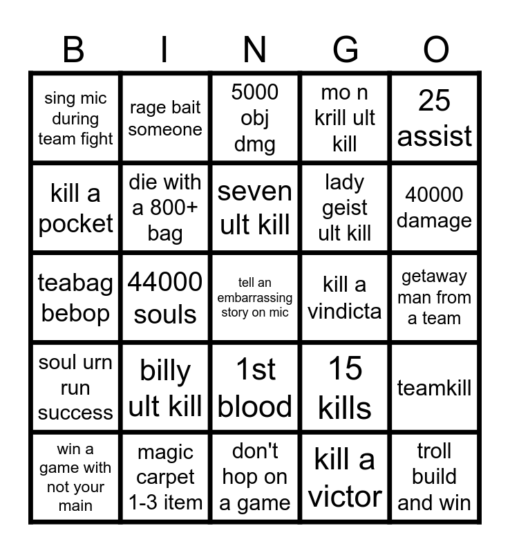 This bingo card has 25 words: billy ult kill, don't hop on a game, seven ult kill, win a game with not your main, 25 assist, sing mic during team fight, kill a pocket, rage bait someone, kill a vindicta, 1st blood, lady geist ult kill, teabag bebop, 15 kills, teamkill, die with a 800+ bag, troll build and win, getaway man from a team, 5000 obj dmg, 40000 damage, 44000 souls, tell an embarrassing story on mic, magic carpet 1-3 item, soul urn run success, mo n krill ult kill and kill a victor.