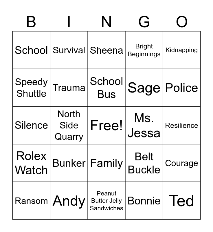 This bingo card has a free space and 24 words: Bunker, Andy, School Bus, Ransom, Kidnapping, School, Speedy Shuttle, Survival, Ms. Jessa, Family, Sage, Silence, Belt Buckle, Courage, Trauma, Bonnie, Resilience, Sheena, Police, North Side Quarry, Ted, Rolex Watch, Bright Beginnings and Peanut Butter Jelly Sandwiches.