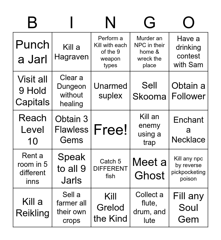This bingo card has a free space and 83 words: Kill a Frost Troll, Shield Bash an NPC from max HP to 0 HP, Perform a Kill with each of the 9 weapon types, Make a Pile of 10 Cheese Wheels, Paralyze a Civilian, Learn 5 new Spells, Pray to Every Divine (Including talos), Complete a Quest, Kill a Guard with a Crossbow, Kill a Daedra, Pickpocket an Enchanted Ring, Killcam a Deer, Clear a Dungeon without healing, Kill an enemy using a trap, Break out of Jail, Punch a Jarl, Kill a Reikling, Visit all 9 Hold Capitals, Clear a Dungeon with no Weapons or Magic, Steal A Dibella Statue, Deliver 20 cases of alcohol to an inn, Sell Skooma, Fill any Soul Gem, Complete Brynjolf's Quest, Obtain 3 Flawless Gems, Kill one NPC from all playable races, Kill a Giant and take it's toe, Contract all 9 contractible diseases, Loot a Unique Item, Win a Brawl, Speak to all 9 Jarls, Die to a Skeever, Get Married, Reach Level 10, 10,000 Total Bounty, Bankrupt a Merchant, Kill Grelod the Kind, Interrupt Rogvir's Execution & Escape, Obtain a Follower, Rent a room in 5 different inns, Enter a Player Home, Donate to all 11 Beggars, Meet both General Tullius & Ulfric Stormcloak, Read 5 Skill Books, Free a Prisoner from Capture, Spend EXACTLY 1000 gold in one shopping trip, Kill a Hagraven, Hold 10,000 Gold, Obtain 5 Words of Power, Fend off 3 contracted attempts on your life, Meet a Ghost, Murder an NPC in their home & wreck the place, Enchant a Necklace, Learn one min. Apprentice Lvl Spell from all 5 schools, Obtain a full Guard uniform from 3 Holds, Obtain a Dragon Claw, Join a Guild, Shoplift 200 gold value from 5 Separate Shops and get away with it, Sell a farmer all their own crops, Feed as a Vampire, Enter a plane of oblivion, Slay a dragon, Obtain a dragon priest's mask, Have a drinking contest with Sam, Kill a child, Kill any npc by reverse pickpocketing poison, Become Thane, Eat 10 stolen sweet rolls, Fail a speech check, Deliver Kharjo's moon amulet, Meet M'aiq the Liar, Acquire any piece of a joinable guild's armor, Cast a master level spell, Catch 5 DIFFERENT fish, Collect a flute, drum, and lute, Kill a chaurus, "We're here to teach you a lesson", Unarmed suplex, Kill someone for skooma, Eat a human body part, Pay 3 different NPCs for training, Consume netch jelly and Learn all 3 words for a single shout.