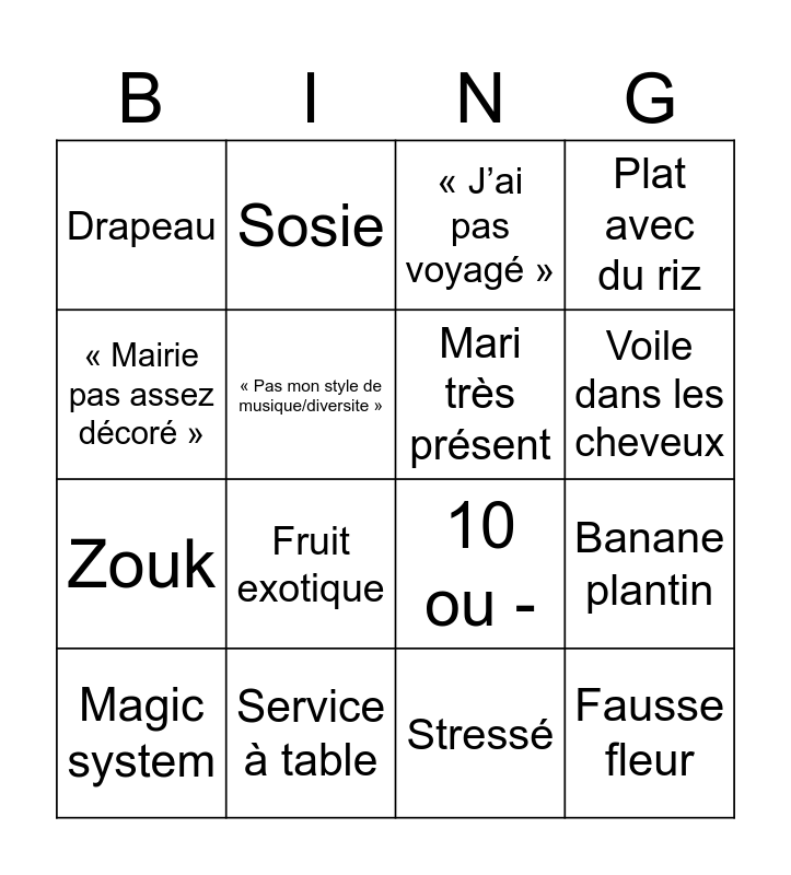 This bingo card has 16 words: Service à table, Banane plantin, « J’ai pas voyagé », Drapeau, Zouk, Sosie, 10 ou -, Stressé, « Mairie pas assez décoré », « Pas mon style de musique/diversite », Magic system, Plat avec du riz, Fruit exotique, Voile dans les cheveux, Mari très présent and Fausse fleur.
