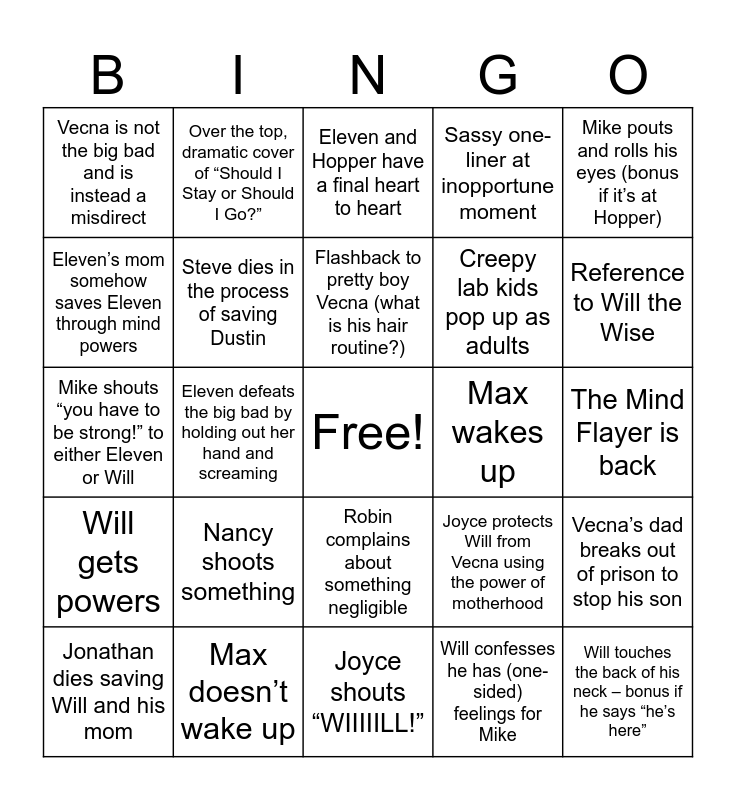 This bingo card has a free space and 29 words: Jonathan dies saving Will and his mom, Will sings “Should I Stay or Should I Go?”, Eleven defeats the big bad by holding out her hand and screaming, Vecna does something sassy (camp Vecna energy), Vecna is not the big bad and is instead a misdirect, Eleven and Hopper have a final heart to heart, Steve dies in the process of saving Dustin, Nancy shoots something, Max wakes up, Max doesn’t wake up, The Mind Flayer is back, Will touches the back of his neck – bonus if he says “he’s here”, Joyce shouts “WIIIIILL!”, Will confesses he has (one-sided) feelings for Mike, Reference to Will the Wise, Robin says Steve’s full name, Robin complains about something negligible, Will gets powers, Mike pouts and rolls his eyes (bonus if it’s at Hopper), Mike shouts “you have to be strong!” to either Eleven or Will, Joyce protects Will from Vecna using the power of motherhood, Random romantic chemistry bewteen Nancy and Steve, Creepy lab kids pop up as adults, Eleven’s mom somehow saves Eleven through mind powers, Sassy one-liner at inopportune moment, Over the top, dramatic cover of “Should I Stay or Should I Go?”, Vecna’s dad breaks out of prison to stop his son, Flashback to pretty boy Vecna (what is his hair routine?) and Mike’s mom does something (bonus if it’s to save Holly).