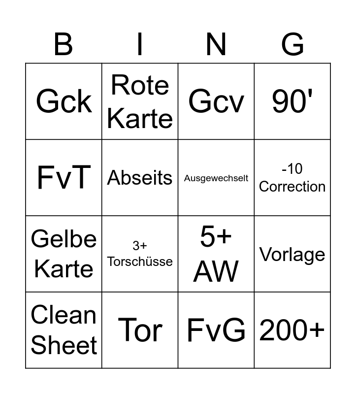 This bingo card has 16 words: Tor, Vorlage, Gcv, Gck, Gelbe Karte, Rote Karte, 5+ AW, FvG, FvT, Abseits, Clean Sheet, 90', 3+ Torschüsse, -10 Correction, Ausgewechselt and 200+.