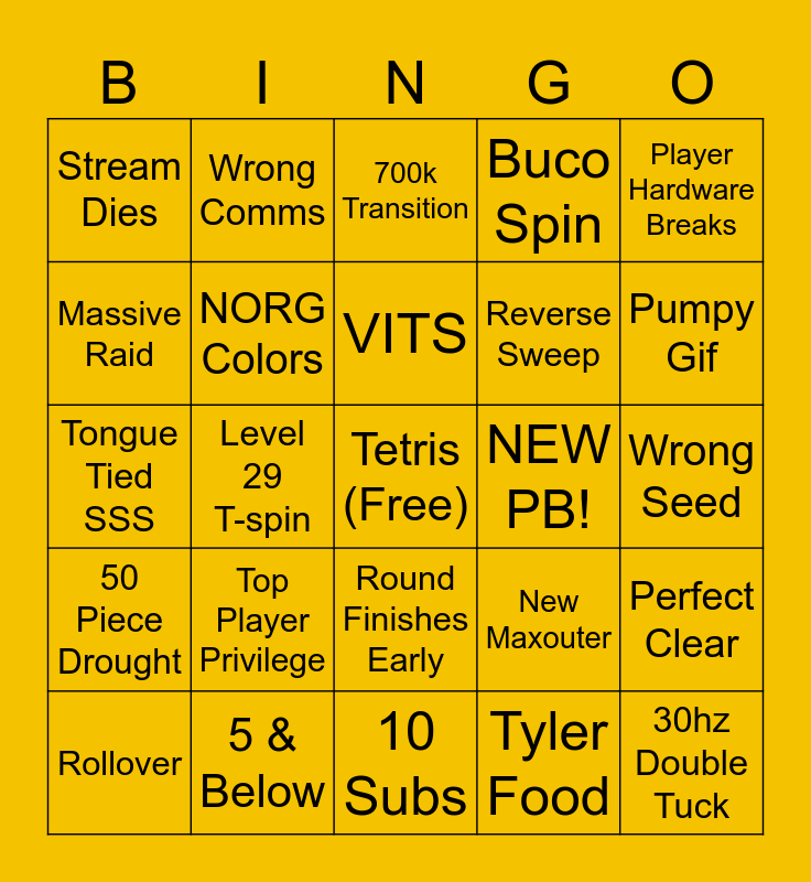 This bingo card has a free space and 24 words: Top Player Privilege, 5 & Below, VITS, Rollover, Player Hardware Breaks, Stream Dies, Massive Raid, Wrong Comms, NEW PB!, Round Finishes Early, Reverse Sweep, Tongue Tied SSS, New Maxouter, Perfect Clear, NORG Colors, Tyler Food, Wrong Seed, 700k Transition, Pumpy Gif, Level 29 T-spin, 30hz Double Tuck, 50 Piece Drought, Buco Spin and 10 Subs.