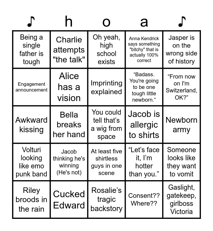 This bingo card has a free space and 24 words: Jacob thinking he's winning (He's not), Cucked Edward, Imprinting explained, Riley broods in the rain, Jasper is on the wrong side of history, Being a single father is tough, Engagement announcement, Charlie attempts "the talk", Jacob is allergic to shirts, At least five shirtless guys in one scene, “Badass. You're going to be one tough little newborn.”, Awkward kissing, “Let’s face it, I’m hotter than you.”, Someone looks like they want to vomit, Alice has a vision, Consent?? Where??, Newborn army, Oh yeah, high school exists, “From now on I'm Switzerland, OK?”, Bella breaks her hand, Gaslight, gatekeep, girlboss Victoria, Volturi looking like emo punk band, Anna Kendrick says something "bitchy" that is actually 100% correct and Rosalie’s tragic backstory.