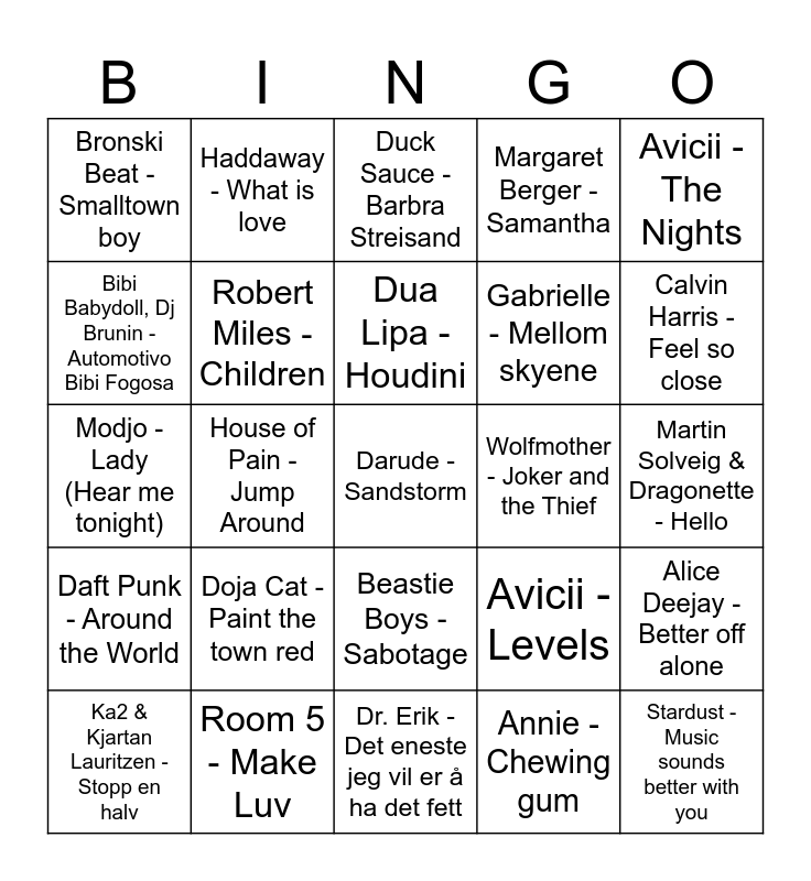 This bingo card has 25 words: Doja Cat - Paint the town red, Dr. Erik - Det eneste jeg vil er å ha det fett, Dua Lipa - Houdini, Ka2 & Kjartan Lauritzen - Stopp en halv, Avicii - The Nights, Bronski Beat - Smalltown boy, Bibi Babydoll, Dj Brunin - Automotivo Bibi Fogosa, Haddaway - What is love, Wolfmother - Joker and the Thief, Beastie Boys - Sabotage, Gabrielle - Mellom skyene, Modjo - Lady (Hear me tonight), Avicii - Levels, Alice Deejay - Better off alone, Robert Miles - Children, Stardust - Music sounds better with you, Martin Solveig & Dragonette - Hello, Duck Sauce - Barbra Streisand, Calvin Harris - Feel so close, House of Pain - Jump Around, Darude - Sandstorm, Room 5 - Make Luv, Daft Punk - Around the World, Margaret Berger - Samantha and Annie - Chewing gum.