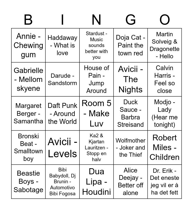 This bingo card has 25 words: Avicii - Levels, Dua Lipa - Houdini, House of Pain - Jump Around, Beastie Boys - Sabotage, Martin Solveig & Dragonette - Hello, Annie - Chewing gum, Gabrielle - Mellom skyene, Haddaway - What is love, Duck Sauce - Barbra Streisand, Ka2 & Kjartan Lauritzen - Stopp en halv, Avicii - The Nights, Margaret Berger - Samantha, Wolfmother - Joker and the Thief, Robert Miles - Children, Darude - Sandstorm, Dr. Erik - Det eneste jeg vil er å ha det fett, Modjo - Lady (Hear me tonight), Stardust - Music sounds better with you, Calvin Harris - Feel so close, Daft Punk - Around the World, Room 5 - Make Luv, Bibi Babydoll, Dj Brunin - Automotivo Bibi Fogosa, Bronski Beat - Smalltown boy, Doja Cat - Paint the town red and Alice Deejay - Better off alone.