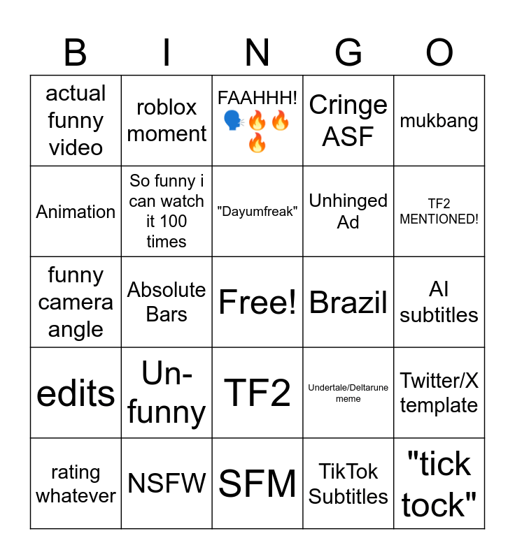 This bingo card has a free space and 24 words: Un-funny, NSFW, "Dayumfreak", rating whatever, mukbang, actual funny video, Animation, roblox moment, Brazil, TF2, Unhinged Ad, funny camera angle, Undertale/Deltarune meme, Twitter/X template, So funny i can watch it 100 times, TikTok Subtitles, AI subtitles, FAAHHH!🗣️🔥🔥🔥, TF2 MENTIONED!, Absolute Bars, "tick tock", edits, Cringe ASF and SFM.