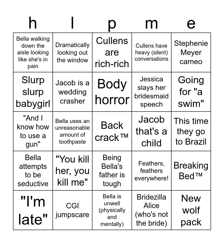 This bingo card has a free space and 24 words: "You kill her, you kill me", CGI jumpscare, Body horror, "I'm late", Stephenie Meyer cameo, Bella walking down the aisle looking like she's in pain, Slurp slurp babygirl, Dramatically looking out the window, Jacob that's a child, Being Bella's father is tough, Jessica slays her bridesmaid speech, "And I know how to use a gun", Feathers, feathers everywhere!, Breaking Bed™, Jacob is a wedding crasher, Bridezilla Alice (who's not the bride), This time they go to Brazil, Cullens are rich-rich, Going for "a swim", Bella uses an unreasonable amount of toothpaste, New wolf pack, Bella attempts to be seductive, Cullens have heavy (silent) conversations and Bella is unwell (physically and mentally).