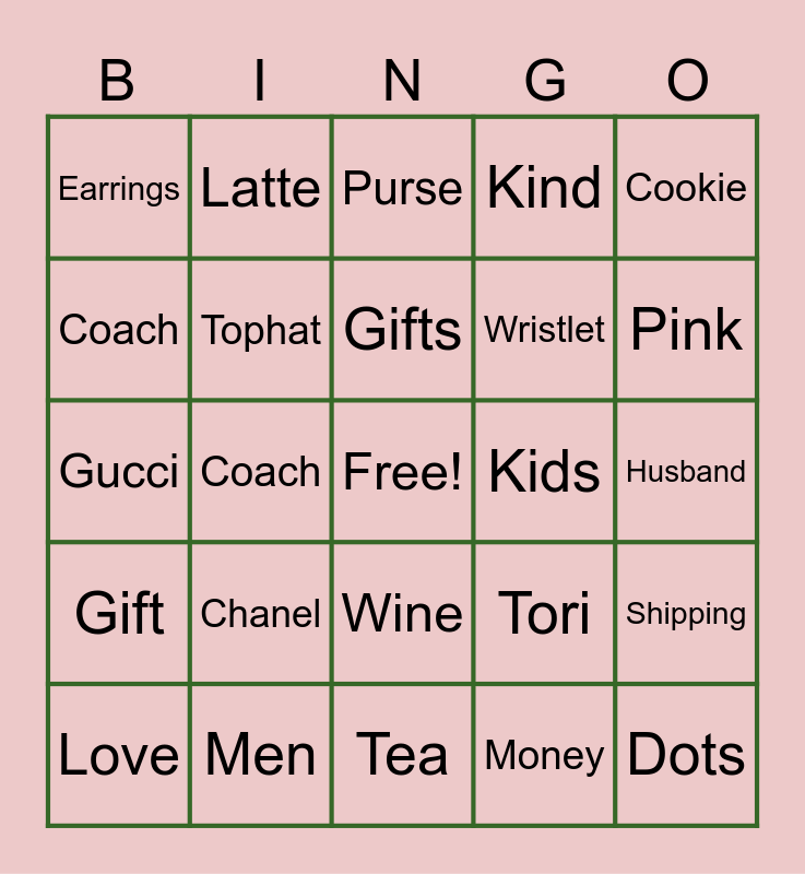 This bingo card has a free space and 44 words: Bag, Dots, Ladies, Love, Lv, Money, Purse, Stripes, Cookie, Men, Kind, Kids, Wine, Chanel, Watch, Tea, Necklace, Gucci, Coffee, Pink, Latte, Facial, Break, Earrings, Happy, Husband, Hats, Cake, Tori, Gift, Smile, Shipping, Sale, Mk, Coach, Santa, Merry, Holiday, Gifts, Coach, Wristlet, Bangle, Tophat and Milk.