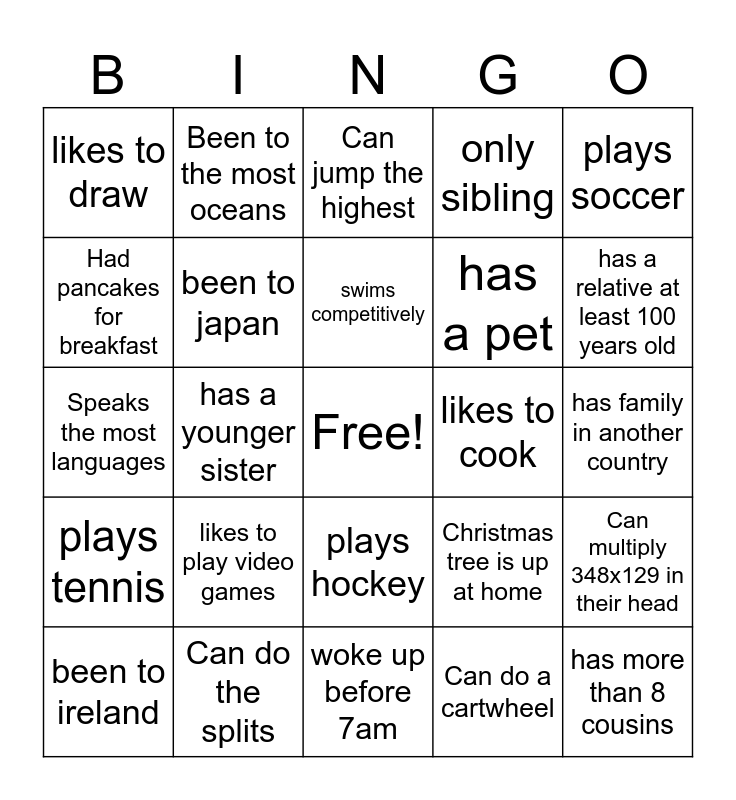 This bingo card has a free space and 39 words: been to hawaii, been to disneyland, been to austrailia, been to japan, been to ireland, plays hockey, swims competitively, rides horses, plays soccer, plays tennis, has a younger sister, only sibling, has more than 8 cousins, has family in another country, likes to cook, likes to play video games, likes to play board games, likes to draw, likes to read, Christmas tree is up at home, Had pancakes for breakfast, woke up before 7am, has a pet, has a relative at least 100 years old, Peanut allergy, Gluten Free, Dairy Free, Allergic to bees, Never broken a bone, Been to the most oceans, Been to the most provinces, Tallest, Can jump the highest, Can do the splits, Can do a cartwheel, Can do a handstand, Can multiply 348x129 in their head, Speaks the most languages and In a choir.