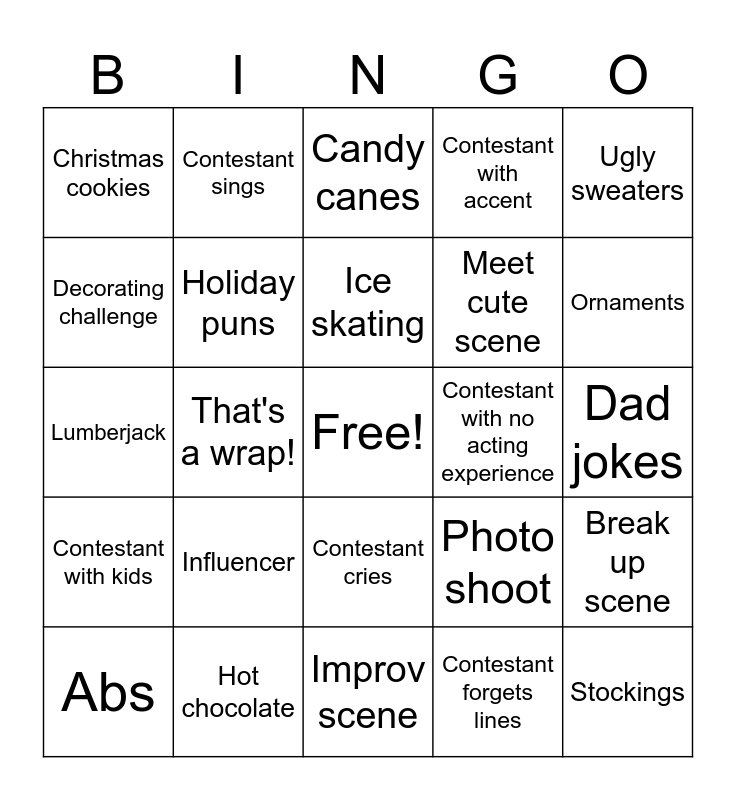 This bingo card has a free space and 26 words: Contestant cries, Contestant forgets lines, Ice skating, Hot chocolate, Ugly sweaters, Christmas cookies, Decorating challenge, Contestant sings, Dad jokes, Photo shoot, Meet cute scene, Lumberjack, Break up scene, Abs, That's a wrap!, Contestant from the midwest, Contestant with accent, Contestant with kids, Candy canes, Stockings, Ornaments, Improv scene, Contestant with no acting experience, Influencer, Holiday puns and Turtleneck.