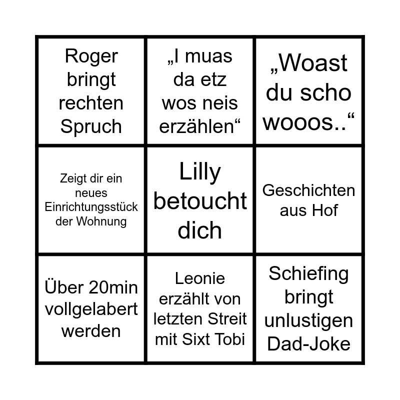 This bingo card has a free space and 8 words: Geschichten aus Hof, „Woast du scho wooos..“, „I muas da etz wos neis erzählen“, Über 20min vollgelabert werden, Roger bringt rechten Spruch, Schiefing bringt unlustigen Dad-Joke, Zeigt dir ein neues Einrichtungsstück der Wohnung and Leonie erzählt von letzten Streit mit Sixt Tobi.
