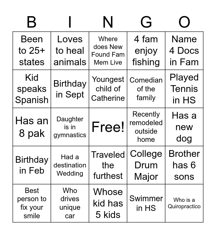 This bingo card has a free space and 29 words: Best person to fix your smile, Can put your smile in line, Daughter is in gymnastics, Visited 10+ Countries, Been to 25+ states, Where does New Found Fam Mem Live, Birthday in Sept, Had a destination Wedding, Recently remodeled outside home, Who drives unique car, Has a new dog, Who is a Quiropractico, Whose kid has 5 kids, Swimmer in HS, Played Tennis in HS, Parent of teenager, Traveled the furthest, Birthday in Feb, Name 4 Docs in Fam, Has an 8 pak, College Drum Major, Kid was top art student in their state, Comedian of the family, Kid speaks Spanish, 4 fam enjoy fishing, Loves to heal animals, Brother has 6 sons, Youngest child of Catherine and 4 members in Divine 9.