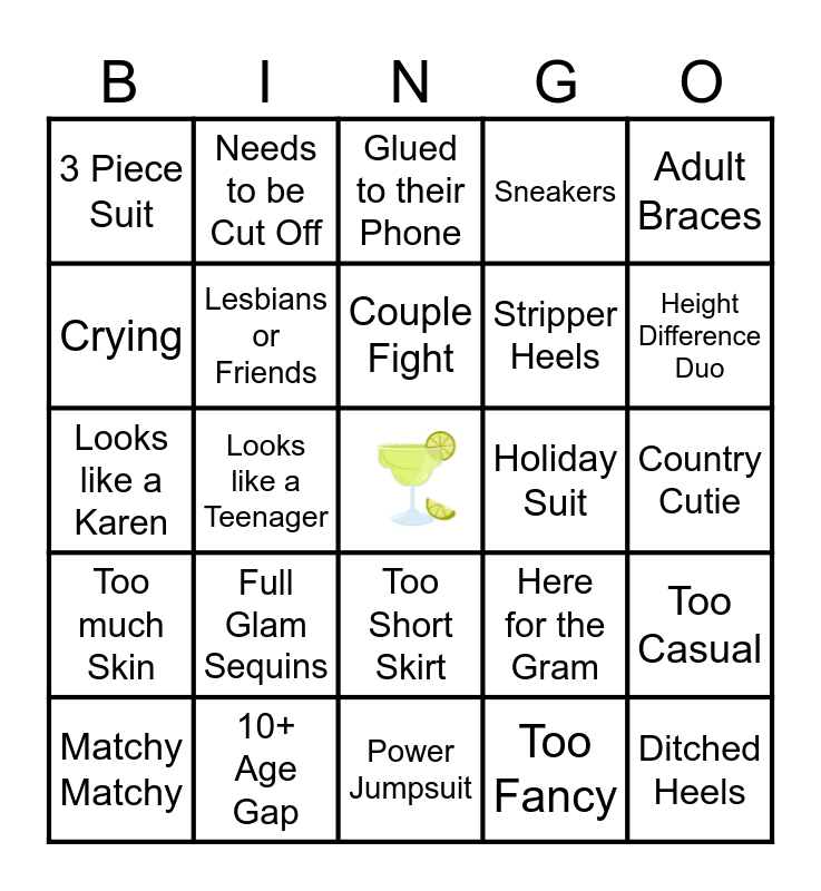This bingo card has a free space and 24 words: Full Glam Sequins, 10+ Age Gap, Couple Fight, Matchy Matchy, Adult Braces, 3 Piece Suit, Crying, Needs to be Cut Off, Holiday Suit, Too Short Skirt, Stripper Heels, Looks like a Karen, Here for the Gram, Too Casual, Lesbians or Friends, Too Fancy, Country Cutie, Glued to their Phone, Height Difference Duo, Looks like a Teenager, Ditched Heels, Too much Skin, Sneakers and Power Jumpsuit.