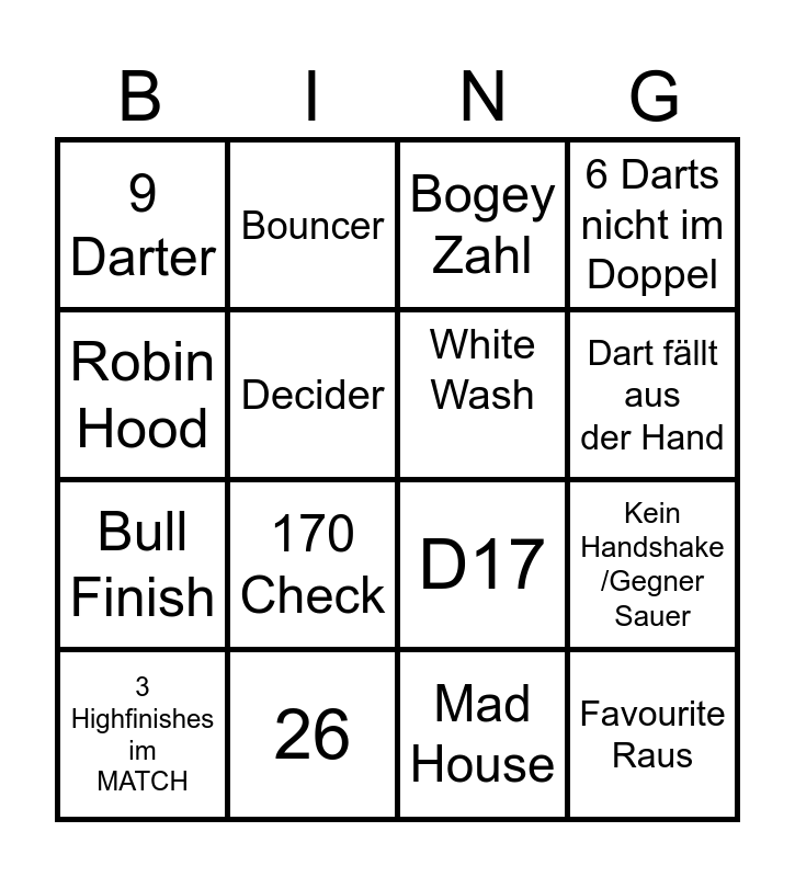 This bingo card has 16 words: 26, Kein Handshake /Gegner Sauer, Bogey Zahl, 9 Darter, Bull Finish, Bouncer, D17, Mad House, Robin Hood, Decider, 3 Highfinishes im MATCH, 6 Darts nicht im Doppel, 170 Check, Dart fällt aus der Hand, White Wash and Favourite Raus.