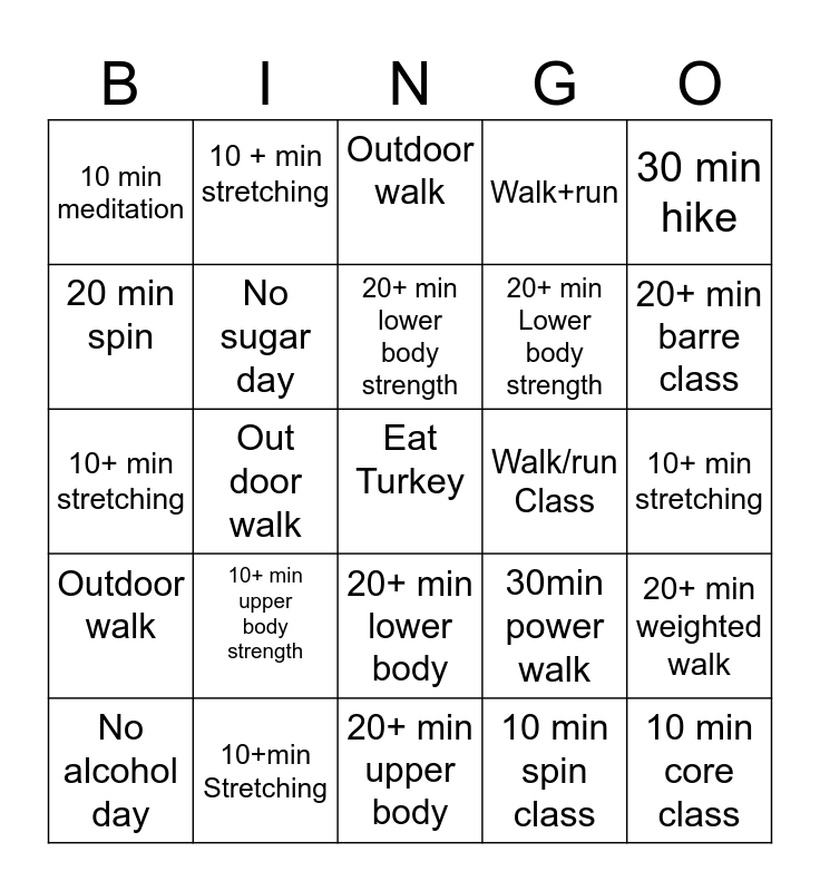This bingo card has a free space and 29 words: 20 min spin class, 10+min Stretching, Outdoor walk, 20 min upper body strength, 30 min hike, 10 min meditation, No sugar day, 20+ min lower body strength, Walk/run Class, 20+ min weighted walk, No alcohol day, Out door walk, 10 min spin class, 10 min core class, 10+ min stretching, 45 min hike, 20+ min upper body, 30min power walk, 20+ min barre class, Outdoor walk, 10+ min upper body strength, 10 min meditation, 20+ min Lower body strength, 10+ min stretching, 20 min spin, 10 + min stretching, 20+ min lower body, Walk+run and 45 min hike.