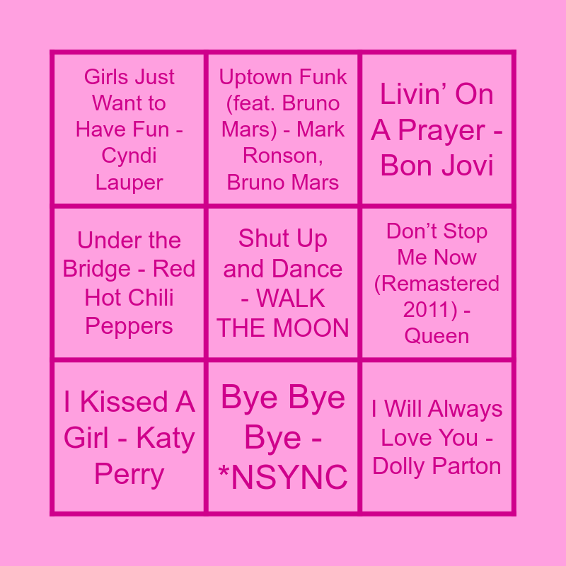 This bingo card has 30 words: Espresso - Sabrina Carpenter, Purple Rain - Prince, The Fate of Ophelia - Taylor Swift, Dancing Queen - ABBA, Girls Just Want to Have Fun - Cyndi Lauper, Livin’ On A Prayer - Bon Jovi, I Kissed A Girl - Katy Perry, Let It Be (Remastered 2009) - The Beatles, Sweet Child O’ Mine - Guns N’ Roses, Walking On Sunshine - Katrina & The Waves, …Baby One More Time - Britney Spears, Every Breath You Take - The Police, Shallow - Lady Gaga, Bradley Cooper, I Ain’t Worried - OneRepublic, Billie Jean - Michael Jackson, Shape of You - Ed Sheeran, Back To Black - Amy Winehouse, Multicolor - Son Mieux, Wannabe - Spice Girls, Shut Up and Dance - WALK THE MOON, I Want It That Way - Backstreet Boys, Love Story (Taylor’s Version) - Taylor Swift, Uptown Funk (feat. Bruno Mars) - Mark Ronson, Bruno Mars, I Will Always Love You - Dolly Parton, Don’t Stop Me Now (Remastered 2011) - Queen, Under the Bridge - Red Hot Chili Peppers, Houdini - Dua Lipa, Boom, Boom, Boom, Boom!! - Vengaboys, Bye Bye Bye - *NSYNC and Piano Man - Billy Joel.