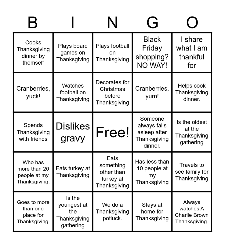 This bingo card has a free space and 32 words: Stays at home for Thanksgiving, Loves pumpkin pie, Dislikes gravy, Decorates for Thanksgiving, Who has more than 20 people at my Thanksgiving., Watches football on Thanksgiving, I share what I am thankful for, Travels to see family for Thanksgiving, Plays board games on Thanksgiving, Eats macaroni and cheese at our meal, Decorates for Christmas before Thanksgiving, Plays football on Thanksgiving, Is a true Black Friday shopper, Is a cyber Monday shopper, Someone always falls asleep after Thanksgiving dinner., Dislikes pumpkin pie, Goes to more than one place for Thanksgiving., Spends Thanksgiving with friends, Eats something other than turkey at Thanksgiving, Eats turkey at Thanksgiving, Has less than 10 people at my Thanksgiving, Wears Thanksgiving socks, Is the oldest at the Thanksgiving gathering, Is the youngest at the Thanksgiving gathering, Always watches A Charlie Brown Thanksgiving., Black Friday shopping? NO WAY!, Cranberries, yum!, Cranberries, yuck!, Cooks Thanksgiving dinner by themself, We do a Thanksgiving potluck., Eats out on Thanksgiving. and Helps cook Thanksgiving dinner..