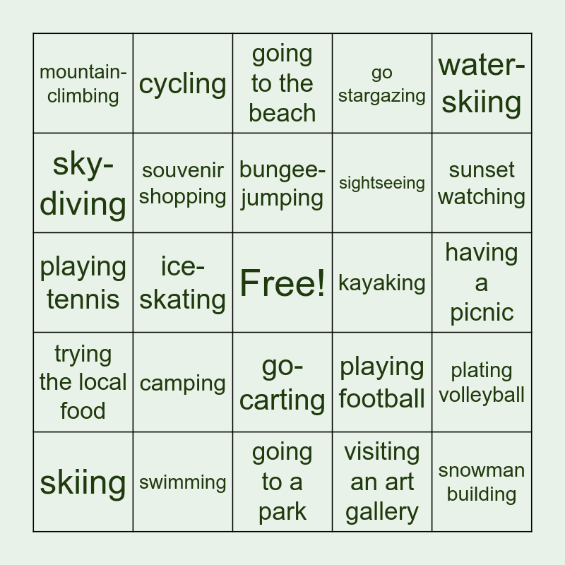This bingo card has a free space and 24 words: camping, swimming, bungee-jumping, skiing, water-skiing, mountain-climbing, sky-diving, cycling, kayaking, go-carting, sightseeing, playing tennis, playing football, plating volleyball, souvenir shopping, visiting an art gallery, having a picnic, going to the beach, sunset watching, ice-skating, snowman building, trying the local food, go stargazing and going to a park.