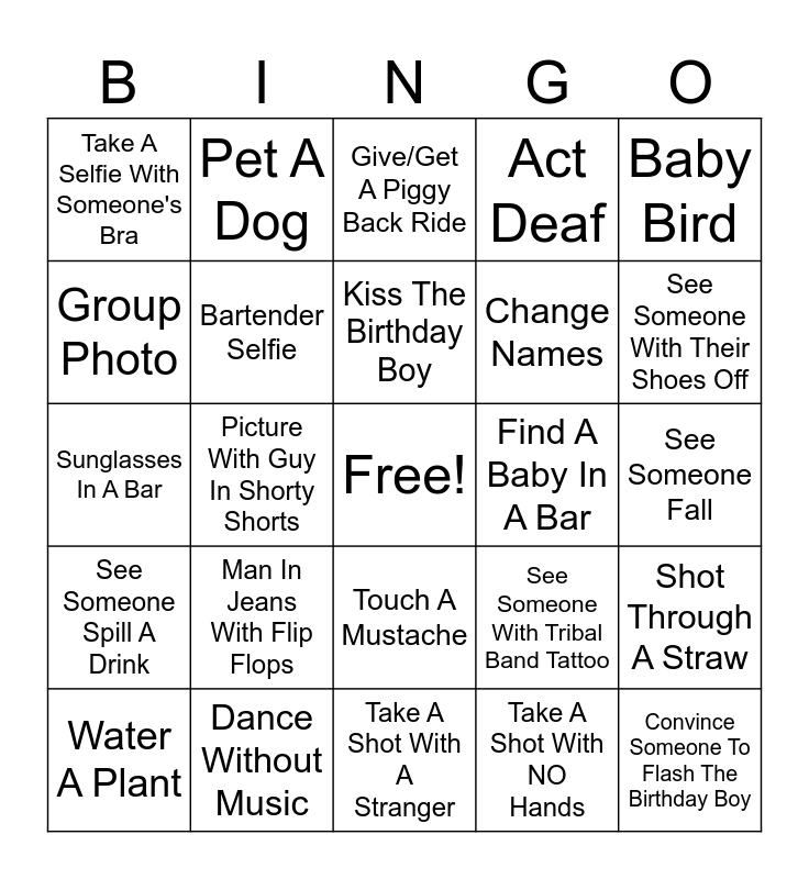 This bingo card has a free space and 29 words: Water A Plant, Ask A Stranger To Taste Their Drink, Picture With Guy In Shorty Shorts, Photo Bomb, Take A Selfie With Someone's Bra, Give/Get A Piggy Back Ride, Bartender Selfie, Man In Jeans With Flip Flops, Find A Baby In A Bar, Dance Without Music, See Someone Fall, Convince Someone To Flash The Birthday Boy, Take A Shot With A Stranger, Take A Shot With NO Hands, See Someone With Their Shoes Off, Get Someone To Buy The Birthday Boy A Shot, Touch A Mustache, See Someone Spill A Drink, Baby Bird, Sunglasses In A Bar, See Someone With Tribal Band Tattoo, Request Pink Pony Club, Change Names, Group Photo, Act Deaf, Pet A Dog, Shot Through A Straw, Kiss The Birthday Boy and Start A Chant.