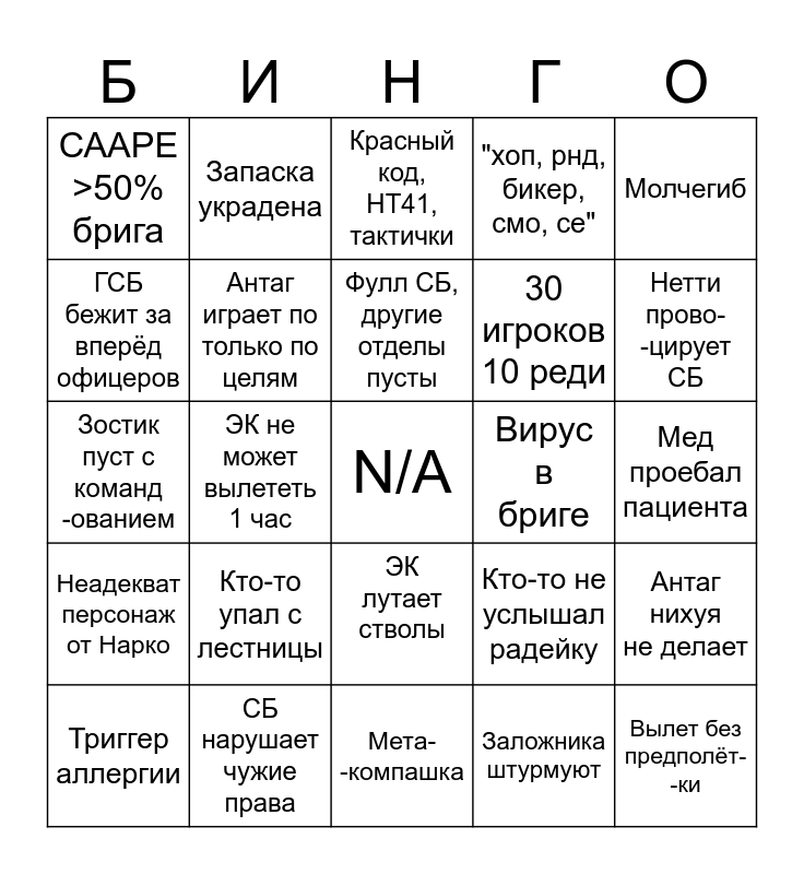 This bingo card has a free space and 24 words: Кто-то упал с лестницы, СБ нарушает чужие права, Фулл СБ, другие отделы пусты, Триггер аллергии, Молчегиб, СААРЕ >50% брига, ГСБ бежит за вперёд офицеров, Запаска украдена, Вирус в бриге, ЭК лутает стволы, 30 игроков 10 реди, Зостик пуст с команд -ованием, Кто-то не услышал радейку, Антаг нихуя не делает, Антаг играет по только по целям, Заложника штурмуют, Мед проебал пациента, Красный код, НТ41, тактички, Нетти прово- -цирует СБ, ЭК не может вылететь 1 час, Вылет без предполёт- -ки, Неадекват персонаж от Нарко, "хоп, рнд, бикер, смо, се" and Мета- -компашка.