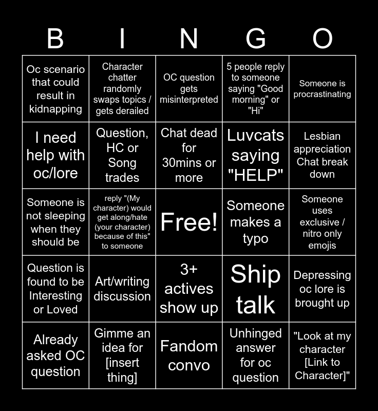This bingo card has a free space and 24 words: Art/writing discussion, Gimme an idea for [insert thing], Chat dead for 30mins or more, Already asked OC question, Someone is procrastinating, Oc scenario that could result in kidnapping, I need help with oc/lore, Character chatter randomly swaps topics / gets derailed, Someone makes a typo, 3+ actives show up, Luvcats saying "HELP", Someone is not sleeping when they should be, Ship talk, Depressing oc lore is brought up, Question, HC or Song trades, Unhinged answer for oc question, Someone uses exclusive / nitro only emojis, OC question gets misinterpreted, Lesbian appreciation Chat break down, reply "(My character) would get along/hate (your character) because of this" to someone, "Look at my character [Link to Character]", Question is found to be Interesting or Loved, 5 people reply to someone saying "Good morning" or "Hi" and Fandom convo.