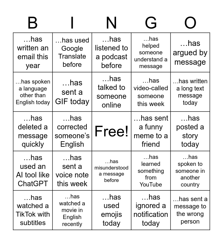 This bingo card has a free space and 25 words: …has sent a voice note this week, …has used emojis today, …has talked to someone online, …has watched a TikTok with subtitles, …has argued by message, …has written an email this year, …has spoken a language other than English today, …has used Google Translate before, …has sent a funny meme to a friend, …has misunderstood a message before, …has video-called someone this week, …has deleted a message quickly, …has learned something from YouTube, …has spoken to someone in another country, …has sent a GIF today, …has made a new online friend, …has posted a story today, …has listened to a podcast before, …has written a long text message today, …has corrected someone’s English, …has sent a message to the wrong person, …has watched a movie in English recently, …has used an AI tool like ChatGPT, …has helped someone understand a message and …has ignored a notification today.