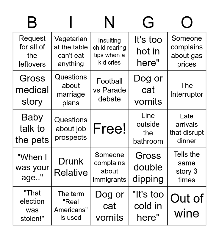This bingo card has a free space and 24 words: Drunk Relative, The term "Real Americans" is used, Football vs Parade debate, "That election was stolen!", Someone complains about gas prices, Request for all of the leftovers, Gross medical story, Vegetarian at the table can't eat anything, Line outside the bathroom, Someone complains about immigrants, Dog or cat vomits, Baby talk to the pets, Gross double dipping, Tells the same story 3 times, Questions about marriage plans, "It's too cold in here", Late arrivals that disrupt dinner, Insulting child rearing tips when a kid cries, The Interruptor, Questions about job prospects, Out of wine, "When I was your age..", It's too hot in here" and Dog or cat vomits.