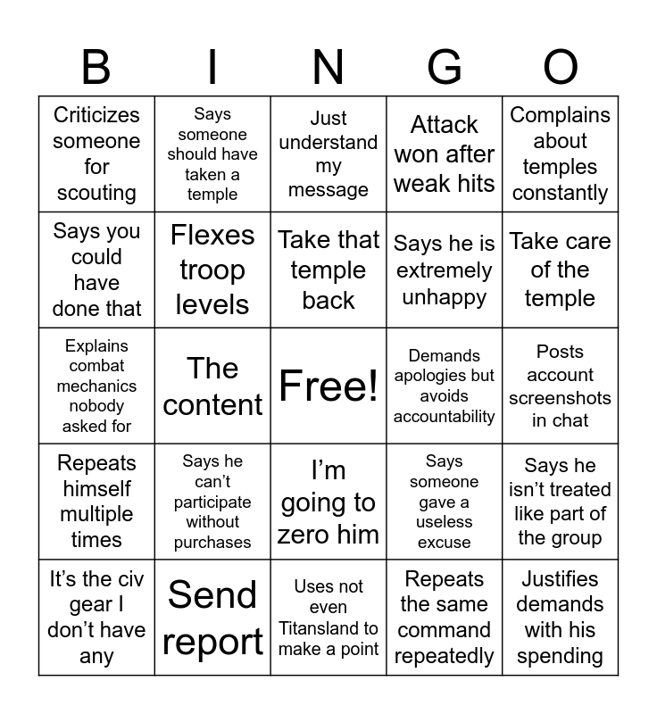 This bingo card has a free space and 115 words: 🫣 sad or angry emoji spam, 50m hit report, Accuses someone of trading points, Actual quote moment, Anything starting with Guys, ASG help with the temples, Attack won after weak hits, Attacking an empty city is unnecessary, Creates drama in WC, Glazes someone with high power, I calculated the hit, I haven’t slept, I weakened him so you could take him down, I zeroed him, I’m all alone, I’m going to bed, I’m going to zero him, I’m out of SOL, I’m really tired, If it weren’t for me, It’s the civ gear I don’t have any, Just understand my message, Not attack a player ghosting, Overconfident then gets smoked, Posts 50m hits constantly, Repeats himself multiple times, Send report, Smoked him after several bad hits, Spams attack won reports after trash hits, Speaks in third person, Take care of the temple, Take that temple back, The content, This is my last SvS, Never helping again, Lectures someone about the content, We are losing a lot of points, We’ve practiced more, Where are you, Why didn’t you rally him, You ignore my style of writing, They are being rude, Gives orders nobody asked for, Tells someone else to take care of it, Demands others handle temples, Gives detailed instructions nobody follows, Repeats the same command repeatedly, Says you could have done that, Insists the alliance needs a clear plan, Holds others to standards he doesn’t follow, Rejects excuses then gives his own, Demands apologies but avoids accountability, Turns simple issues into moral lectures, Accuses others of assuming while he assumes, Claims he is being attacked when given feedback, Sends rapid fire messages expecting instant replies, Complains he’s tired, Says it’s too early or too late where he is, Claims he hasn’t slept, Claims he’s being attacked by many people, Says he isn’t treated like part of the group, Claims limited patience, Says he doesn’t have enough resources, Says he can’t play SvS without buying things, Brags about his alt accounts, Lists power levels, Says he’s done something thousands of times, Flexes troop levels, Explains combat mechanics nobody asked for, Shows rally resistance stats, Posts account screenshots in chat, Uses spending as proof of dedication, Says he bought packages, Mentions dollar amounts spent, Says he borrowed money for packages, Justifies demands with his spending, Says he can’t participate without purchases, Criticizes someone for scouting, Blames someone for not rallying, Says someone ruined an agreement, Says someone cost him resources, Says someone should have taken a temple, Complains others aren’t online, Says someone gave a useless excuse, Says he is extremely unhappy, Turns small problems into big fusses, Uses sad emojis to guilt trip, Says someone emotionally attacked him, Makes minor disagreements personal, Sends multiple long paragraphs, Breaks down rallies in unnecessary detail, Overexplains events nobody remembers, Justifies every action with long reasoning, Tries to educate others repeatedly, Complains about temples constantly, Repeats take the temple in different wording, Directs multiple people to manage temples, Compares servers to justify complaints, Says send one troop, Blames someone for temple mistakes, Asks if everyone is ready for SvS, Worries he can’t play without resources, Says his spending is required for SvS, Claims others aren’t prepared, Gives last minute SvS instructions, Brags then complains then plays victim, Demands instant attention, Talks about alt accounts more than the main, Uses not even Titansland to make a point, Switches from helpful to hostile quickly, Repeats arguments multiple times, Turns disagreements into speeches, Contradicts himself, Reacts emotionally to neutral statements and Shifts between team leader and outsider victim.