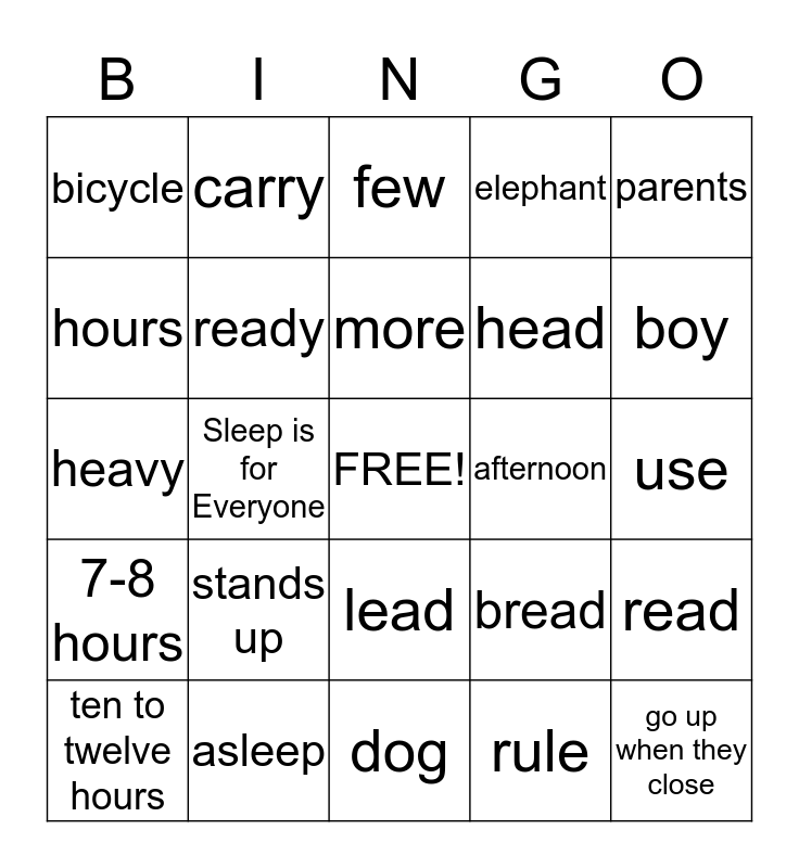 This bingo card has a free space and 24 words: stands up, asleep, more, ten to twelve hours, parents, bicycle, hours, carry, afternoon, lead, head, heavy, bread, read, ready, rule, use, few, boy, Sleep is for Everyone, go up when they close, 7-8 hours, elephant and dog.