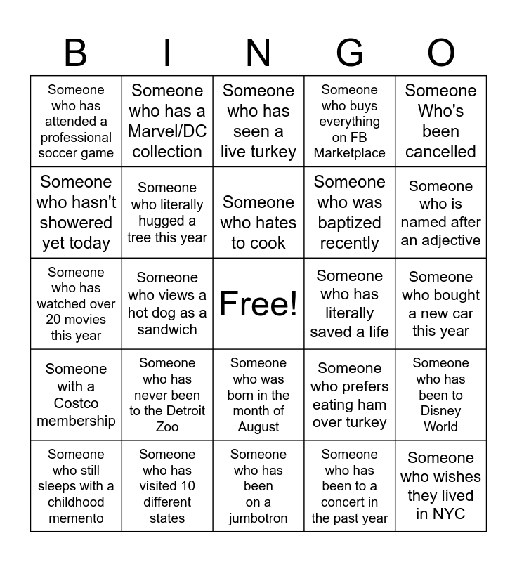 This bingo card has a free space and 28 words: Someone who drives a Subaru, Someone who has visited 10 different states, Someone who hates to cook, Someone who has been to a concert in the past year, Someone Who's been cancelled, Someone who has attended a professional soccer game, Someone who literally hugged a tree this year, Someone who has been on a jumbotron, Someone who has literally saved a life, Someone who has been to Disney World, Someone who has watched over 20 movies this year, Someone who views a hot dog as a sandwich, Someone who prefers eating ham over turkey, Someone who wishes they lived in NYC, Someone who hasn't showered yet today, Someone who was in a fraternity, Someone who was born in the month of August, Someone who buys everything on FB Marketplace, Someone who is named after an adjective, Someone who still sleeps with a childhood memento, Someone who has a Marvel/DC collection, Someone who played a sport in college, Someone who was baptized recently, Someone who bought a new car this year, Someone with a Costco membership, Someone who has never been to the Detroit Zoo, Someone who has seen a live turkey and Someone who likes the taste of cranberry sauce.