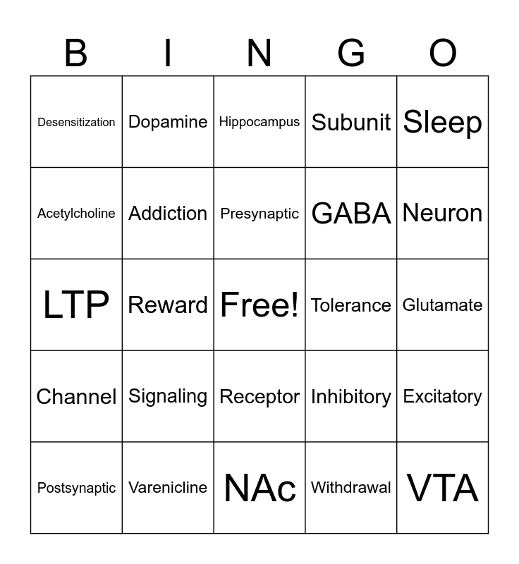 This bingo card has a free space and 24 words: Signaling, Varenicline, Presynaptic, Postsynaptic, Sleep, Desensitization, Acetylcholine, Dopamine, Tolerance, Receptor, GABA, LTP, Inhibitory, Excitatory, Addiction, Withdrawal, Glutamate, Hippocampus, Neuron, Reward, VTA, Channel, Subunit and NAc.