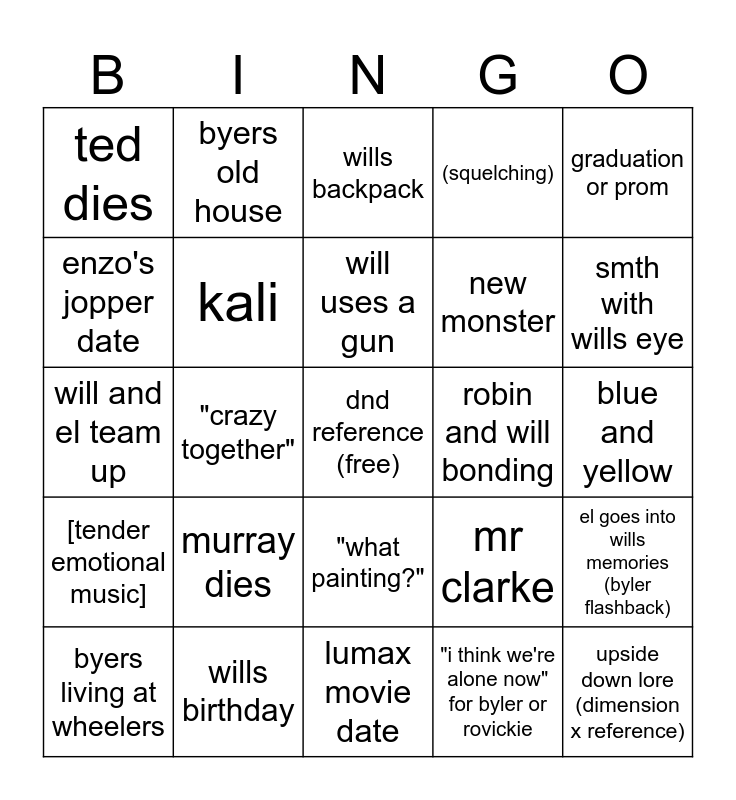 This bingo card has a free space and 24 words: murray dies, wills birthday, will uses a gun, byers living at wheelers, graduation or prom, ted dies, enzo's jopper date, byers old house, robin and will bonding, "what painting?", new monster, will and el team up, mr clarke, el goes into wills memories (byler flashback), kali, "i think we're alone now" for byler or rovickie, blue and yellow, wills backpack, smth with wills eye, "crazy together", upside down lore (dimension x reference), [tender emotional music], (squelching) and lumax movie date.