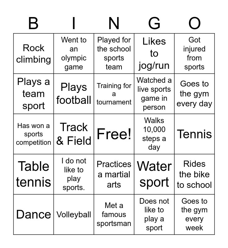 This bingo card has a free space and 24 words: I do not like to play sports., Volleyball, Training for a tournament, Dance, Got injured from sports, Rock climbing, Plays a team sport, Went to an olympic game, Walks 10,000 steps a day, Practices a martial arts, Watched a live sports game in person, Has won a sports competition, Water sport, Rides the bike to school, Plays football, Does not like to play a sport, Tennis, Played for the school sports team, Goes to the gym every day, Track & Field, Goes to the gym every week, Table tennis, Likes to jog/run and Met a famous sportsman.