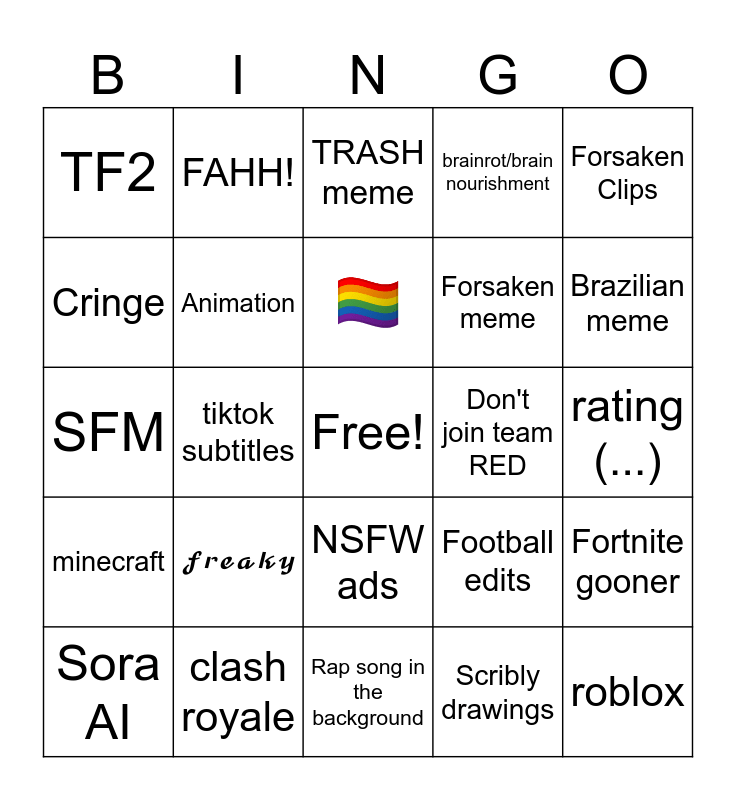 This bingo card has a free space and 24 words: 𝓯𝓻𝓮𝓪𝓴𝔂, clash royale, 🏳️🌈, Sora AI, Forsaken Clips, TF2, Cringe, FAHH!, Don't join team RED, NSFW ads, Forsaken meme, SFM, Football edits, Fortnite gooner, Animation, Scribly drawings, rating (...), TRASH meme, Brazilian meme, tiktok subtitles, roblox, minecraft, brainrot/brain nourishment and Rap song in the background.