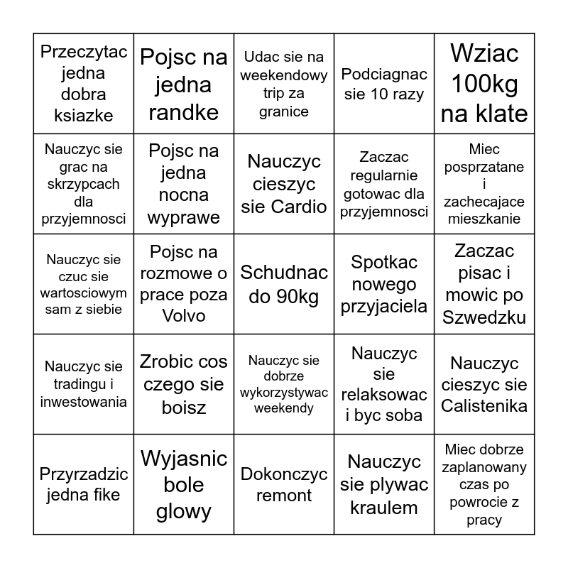 This bingo card has 25 words: Zrobic cos czego sie boisz, Dokonczyc remont, Nauczyc cieszyc sie Cardio, Przyrzadzic jedna fike, Wziac 100kg na klate, Przeczytac jedna dobra ksiazke, Nauczyc sie grac na skrzypcach dla przyjemnosci, Pojsc na jedna randke, Spotkac nowego przyjaciela, Nauczyc sie dobrze wykorzystywac weekendy, Zaczac regularnie gotowac dla przyjemnosci, Nauczyc sie czuc sie wartosciowym sam z siebie, Nauczyc sie relaksowac i byc soba, Nauczyc cieszyc sie Calistenika, Pojsc na jedna nocna wyprawe, Miec dobrze zaplanowany czas po powrocie z pracy, Zaczac pisac i mowic po Szwedzku, Udac sie na weekendowy trip za granice, Miec posprzatane i zachecajace mieszkanie, Pojsc na rozmowe o prace poza Volvo, Schudnac do 90kg, Wyjasnic bole glowy, Nauczyc sie tradingu i inwestowania, Podciagnac sie 10 razy and Nauczyc sie plywac kraulem.