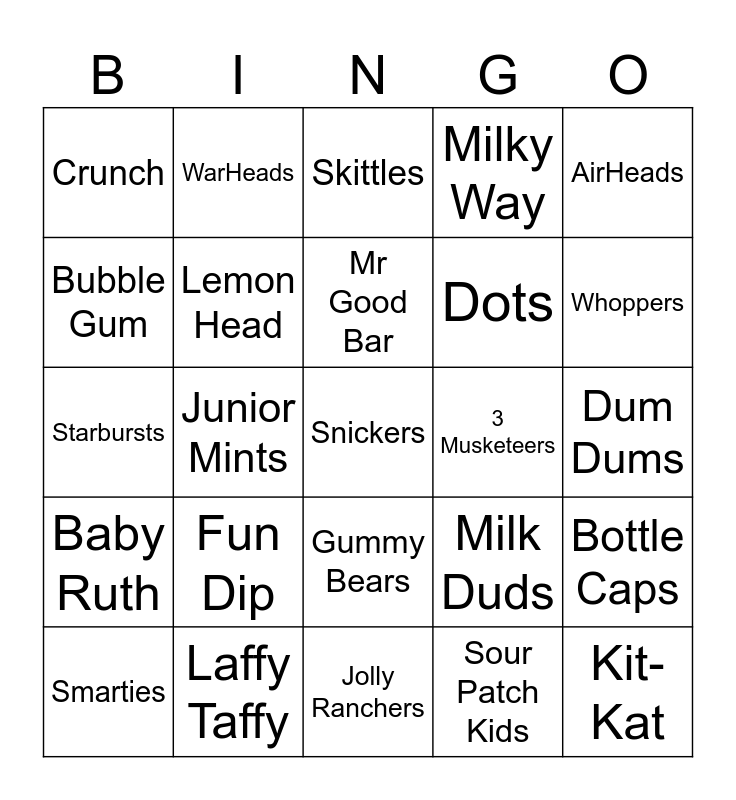 This bingo card has a free space and 45 words: Free!, Kit-Kat, Hersheys, Smarties, Twix, Sour Patch Kids, Skittles, M&Ms, AirHeads, Laffy Taffy, Milky Way, 3 Musketeers, Gummy Bears, Fun Dip, SweetTarts, Jolly Ranchers, Twizzlers, Starbursts, Rolo, Whoppers, WarHeads, Reeses, Butter Finger, Crunch, Tootsie Rolls, Dum Dums, Pixi Stix, Sour Punch Straws, Milk Duds, Baby Ruth, Life Savers, Bottle Caps, Pop Rocks, Pez, Pay Day, Junior Mints, Reeses Pieces, Werthers, Candy Corn, Mr Good Bar, Bubble Gum, Dots, Gushers, Lemon Head and Ring Pop.