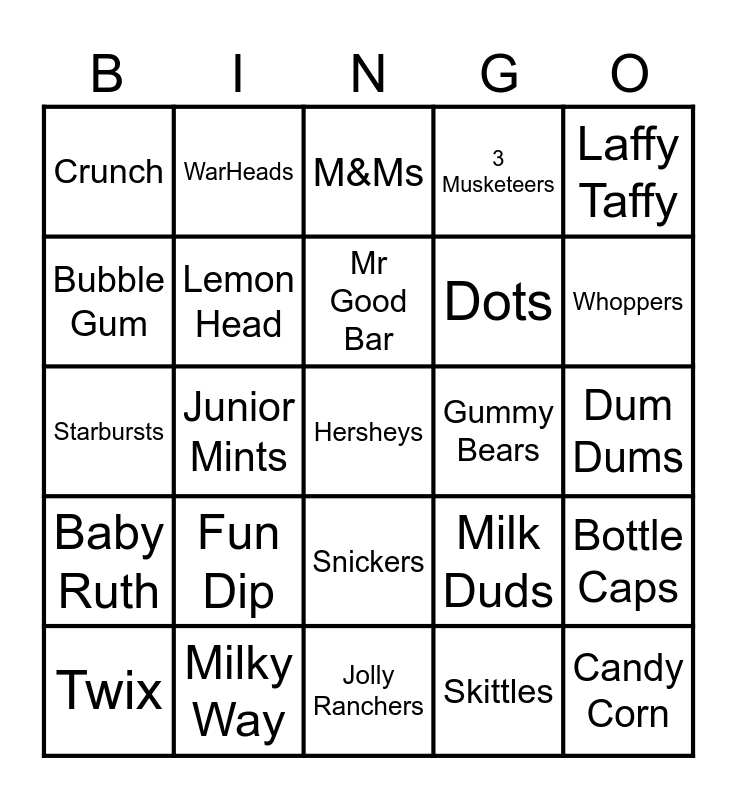 This bingo card has 45 words: Kit-Kat, Hersheys, Smarties, Twix, Sour Patch Kids, Skittles, M&Ms, AirHeads, Laffy Taffy, Milky Way, 3 Musketeers, Gummy Bears, Snickers, Fun Dip, SweetTarts, Jolly Ranchers, Twizzlers, Starbursts, Rolo, Whoppers, WarHeads, Reeses, Butter Finger, Crunch, Tootsie Rolls, Dum Dums, Pixi Stix, Sour Punch Straws, Milk Duds, Baby Ruth, Life Savers, Bottle Caps, Pop Rocks, Pez, Pay Day, Junior Mints, Reeses Pieces, Werthers, Candy Corn, Mr Good Bar, Bubble Gum, Dots, Gushers, Lemon Head and Ring Pop.