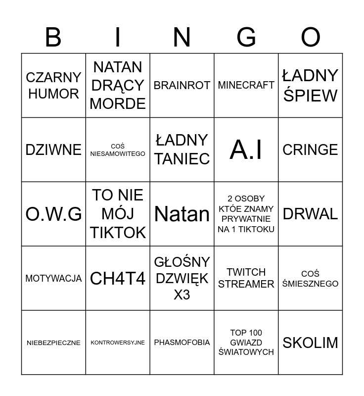 This bingo card has a free space and 24 words: CH4T4, KONTROWERSYJNE, ŁADNY TANIEC, NIEBEZPIECZNE, ŁADNY ŚPIEW, CZARNY HUMOR, DZIWNE, NATAN DRĄCY MORDE, 2 OSOBY KTÓE ZNAMY PRYWATNIE NA 1 TIKTOKU, GŁOŚNY DZWIĘK X3, A.I, O.W.G, TWITCH STREAMER, COŚ ŚMIESZNEGO, COŚ NIESAMOWITEGO, TOP 100 GWIAZD ŚWIATOWYCH, DRWAL, BRAINROT, CRINGE, TO NIE MÓJ TIKTOK, SKOLIM, MOTYWACJA, MINECRAFT and PHASMOFOBIA.