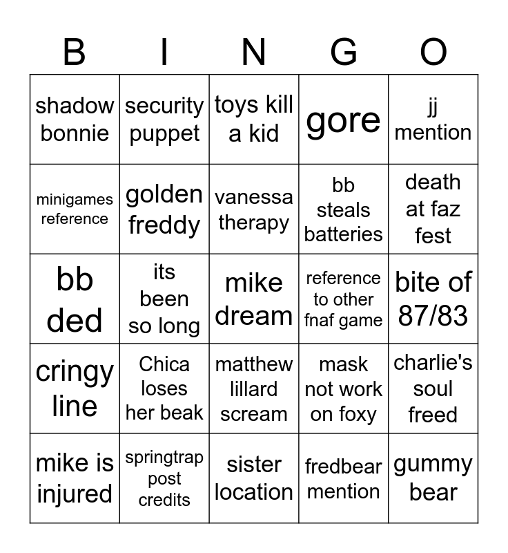 This bingo card has a free space and 24 words: Chica loses her beak, springtrap post credits, vanessa therapy, mike is injured, jj mention, shadow bonnie, minigames reference, security puppet, reference to other fnaf game, matthew lillard scream, bb steals batteries, bb ded, mask not work on foxy, charlie's soul freed, golden freddy, fredbear mention, bite of 87/83, toys kill a kid, death at faz fest, its been so long, gummy bear, cringy line, gore and sister location.