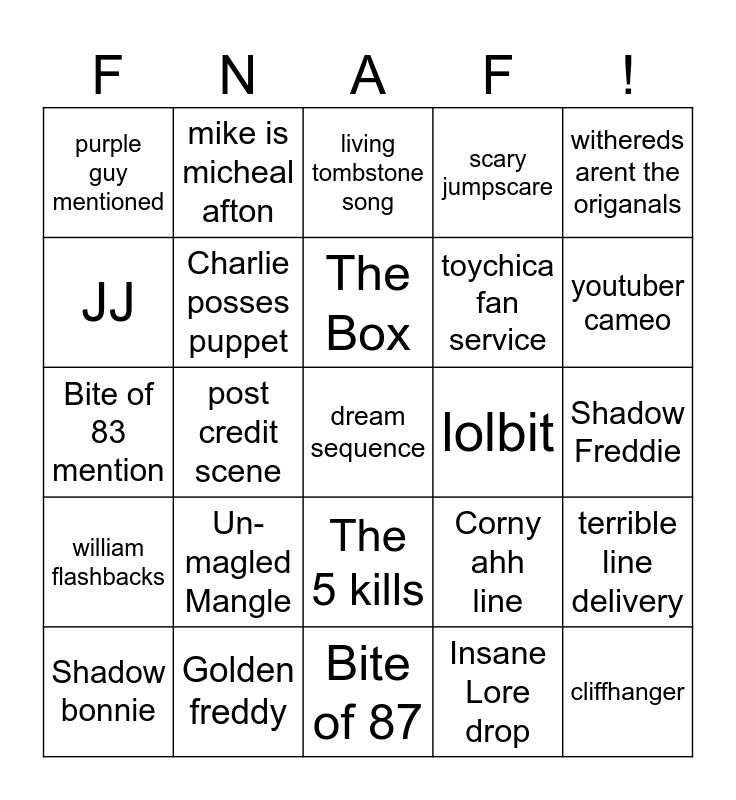 This bingo card has 25 words: Un-magled Mangle, Bite of 87, The Box, Shadow bonnie, withereds arent the origanals, purple guy mentioned, JJ, mike is micheal afton, lolbit, The 5 kills, toychica fan service, Bite of 83 mention, Corny ahh line, terrible line delivery, Charlie posses puppet, cliffhanger, Shadow Freddie, living tombstone song, youtuber cameo, post credit scene, dream sequence, Golden freddy, william flashbacks, scary jumpscare and Insane Lore drop.