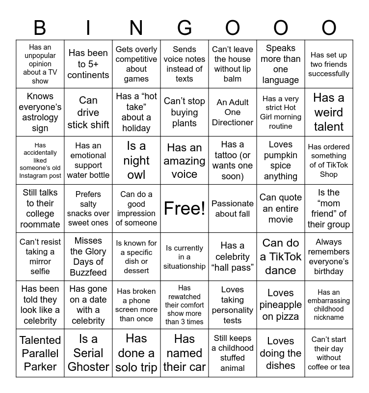 This bingo card has a free space and 49 words: Loves pineapple on pizza, Has a very strict Hot Girl morning routine, Still keeps a childhood stuffed animal, Prefers salty snacks over sweet ones, Is a night owl, Is the “mom friend” of their group, Has been to 5+ continents, Has done a solo trip, Speaks more than one language, Is currently in a situationship, Has set up two friends successfully, Sends voice notes instead of texts, Loves pumpkin spice anything, Has a tattoo (or wants one soon), Has gone on a date with a celebrity, Can quote an entire movie, Knows everyone’s astrology sign, Has a weird talent, Has an embarrassing childhood nickname, Can’t leave the house without lip balm, An Adult One Directioner, Can do a good impression of someone, Has an unpopular opinion about a TV show, Can drive stick shift, Talented Parallel Parker, Has a “hot take” about a holiday, Has ordered something of of TikTok Shop, Is a Serial Ghoster, Has an amazing voice, Has an emotional support water bottle, Has cried at work (no shame!), Passionate about fall, Has been told they look like a celebrity, Has broken a phone screen more than once, Still talks to their college roommate, Has a celebrity “hall pass”, Can do a TikTok dance, Always remembers everyone’s birthday, Has accidentally liked someone’s old Instagram post, Is known for a specific dish or dessert, Has rewatched their comfort show more than 3 times, Can’t resist taking a mirror selfie, Can’t start their day without coffee or tea, Has named their car, Can’t stop buying plants, Gets overly competitive about games, Loves taking personality tests, Misses the Glory Days of Buzzfeed and Loves doing the dishes.