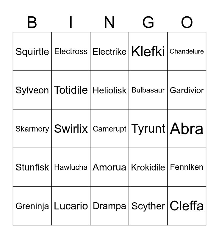 This bingo card has 25 words: Hawlucha, Drampa, Heliolisk, Greninja, Chandelure, Squirtle, Sylveon, Electross, Tyrunt, Amorua, Bulbasaur, Skarmory, Krokidile, Fenniken, Totidile, Cleffa, Abra, Electrike, Gardivior, Swirlix, Camerupt, Lucario, Stunfisk, Klefki and Scyther.